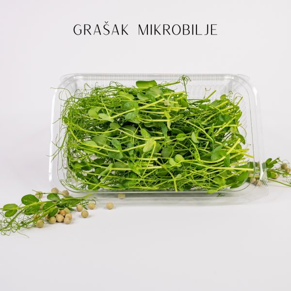 Mikrobilje graška su mladi izdanci graška, poznati po slatkastom ukusu i hrskavoj teksturi, koja podseća na svež grašak. Ovi izdanci su bogati vitaminima A, C, E i K, kao i mineralima poput gvožđa, kalcijuma i magnezijuma, što doprinosi opštem zdravlju i jačanju imunološkog sistema. Mikrobilje graška sadrži i visoke nivoe proteina i vlakana, što pomaže u održavanju zdrave probave i energičnosti. Može se koristiti u salatama, sendvičima, supama ili kao dodatak raznim jelima.