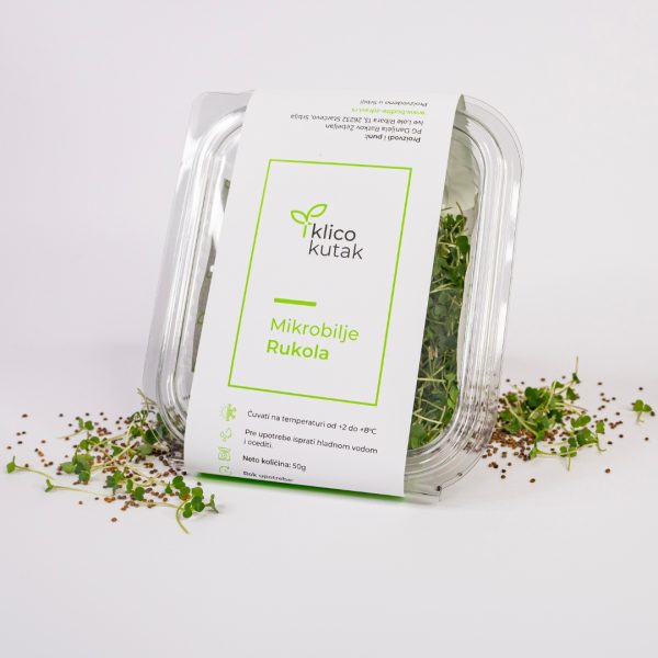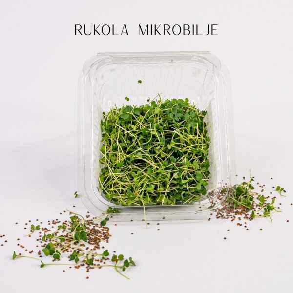 Mikrobilje rukole su mladi izdanci rukole koji imaju intenzivan, pikantan i blago orašast ukus, karakterističan za ovo zeleno lisnato povrće. Bogato je vitaminima A, C i K, kao i mineralima poput kalcijuma, gvožđa i magnezijuma, što podržava zdravlje kostiju, imunitet i metabolizam. Mikrobilje rukole sadrži i snažne antioksidante i fitonutrijente, poput glukozinolata, koji pomažu u zaštiti ćelija i detoksikaciji organizma. Odličan dodatak salatama, pastama, sendvičima ili kao začin za razna jela.